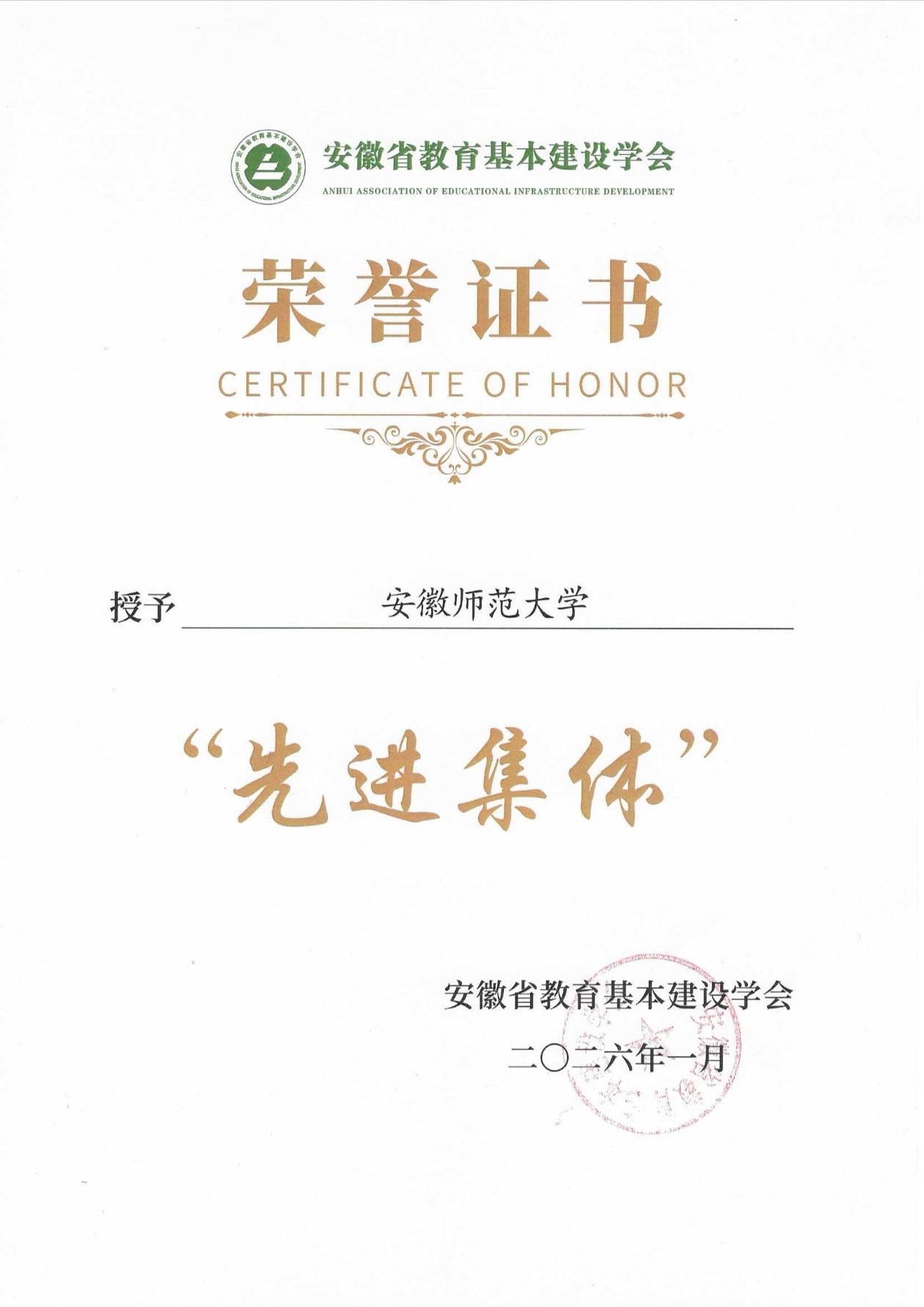 2026年1月16日,安徽省教育基本建设学会第七次会员代表大会在合肥召开。大会现场表彰了全省教育基建领域成效突出的单位,我校获评“安徽省教育基本建设学会先进集体”荣誉称号。